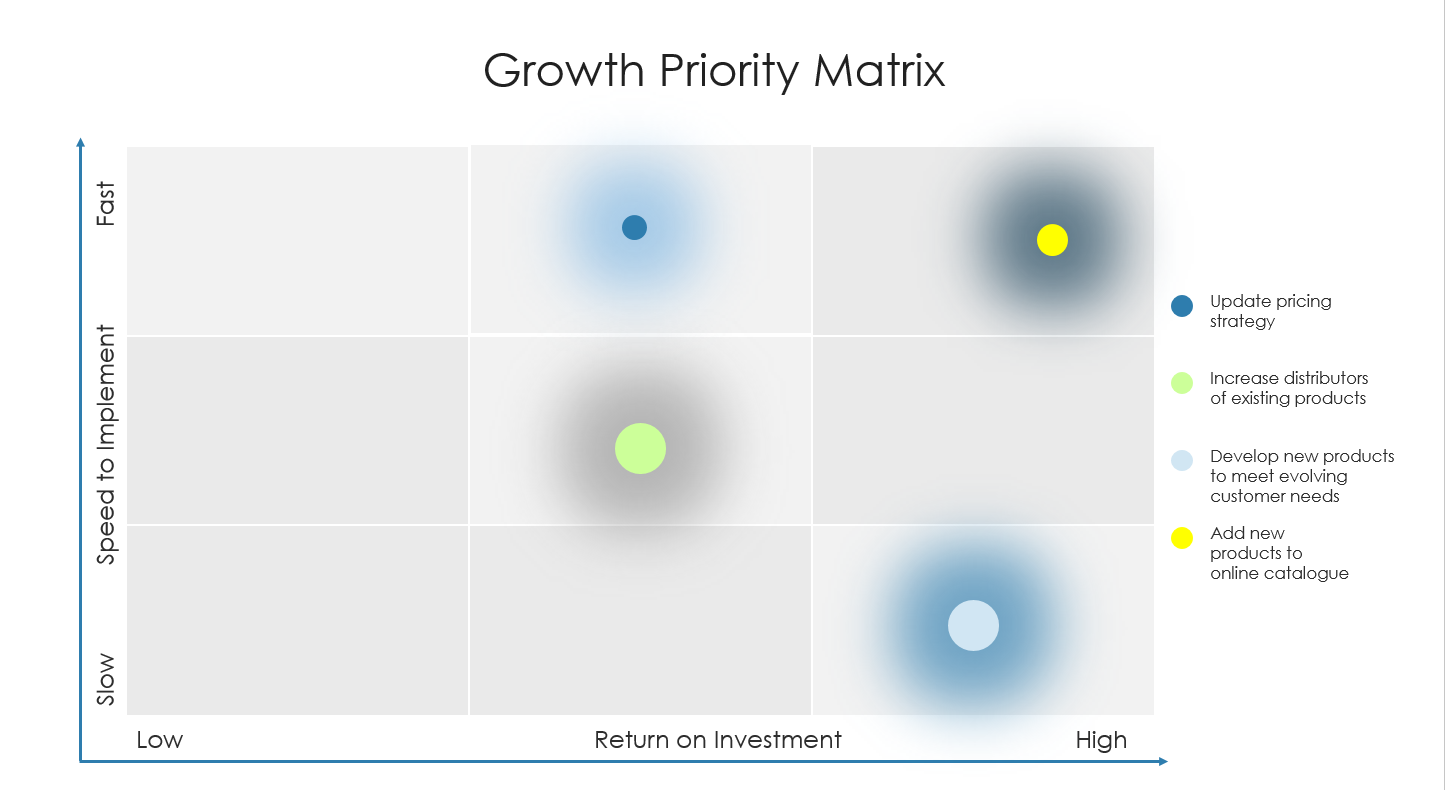 Moving post COVID, businesses should take an opportunity to take a step back and prioritise which growth options and activities can have the most impact for capital invested over the next 12 months. This exercise does not need to be complex but can provide a necessary focus. In the example below, the highest priorities might be amending the pricing strategy to account for less customers in-store and adding to the online products catalogue. The size of each circle reflects the effort required (smaller means less time), the higher on the matrix the faster to implement, and the further across indicates the level of return on investment opportunity.