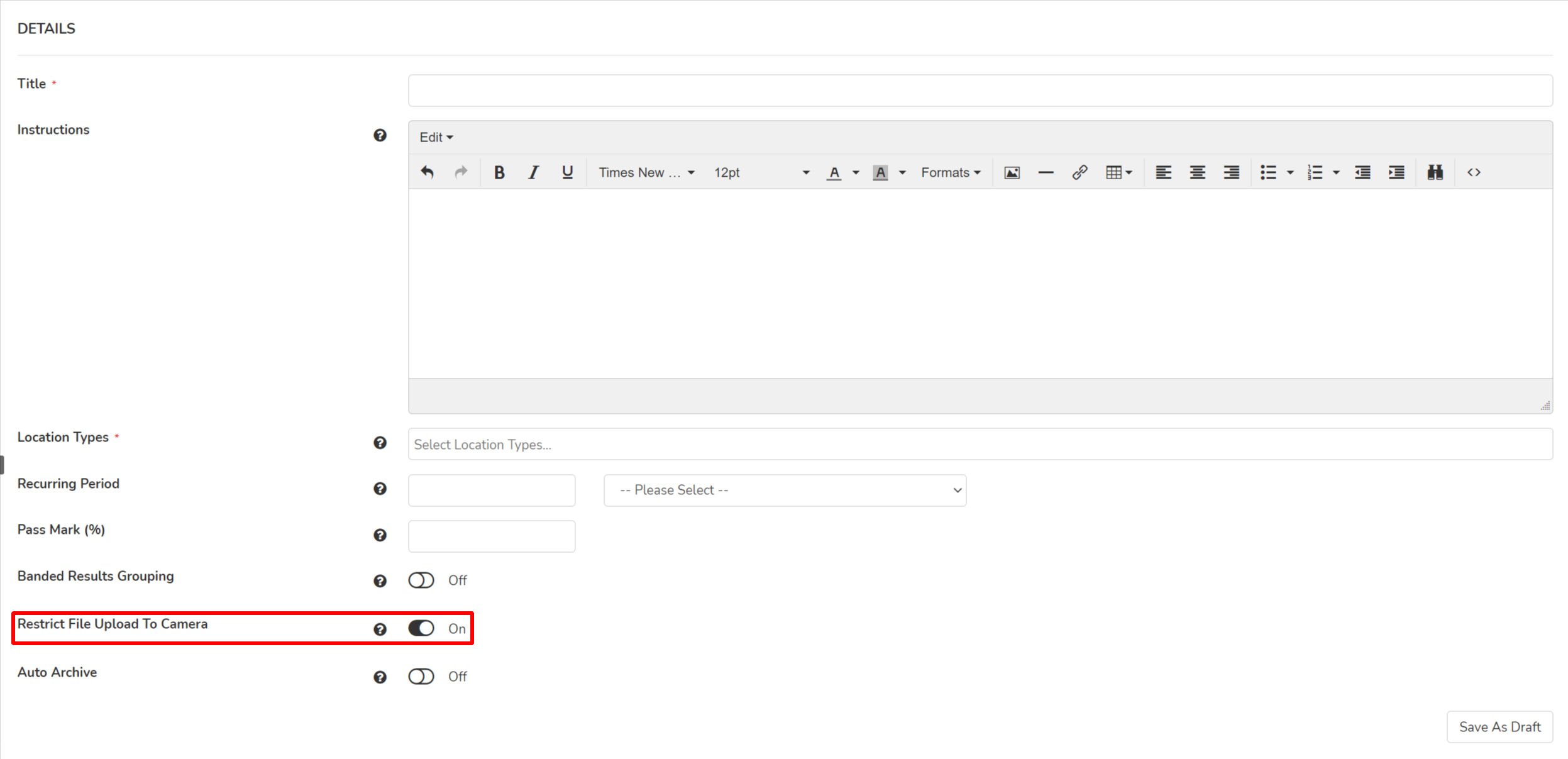 There are only a few required details to get you started. If you want to get the most out of your audits (and improve compliance) select ‘restrict file upload to camera’. That’s going to ensure no one is able to upload old images from their camera roll!